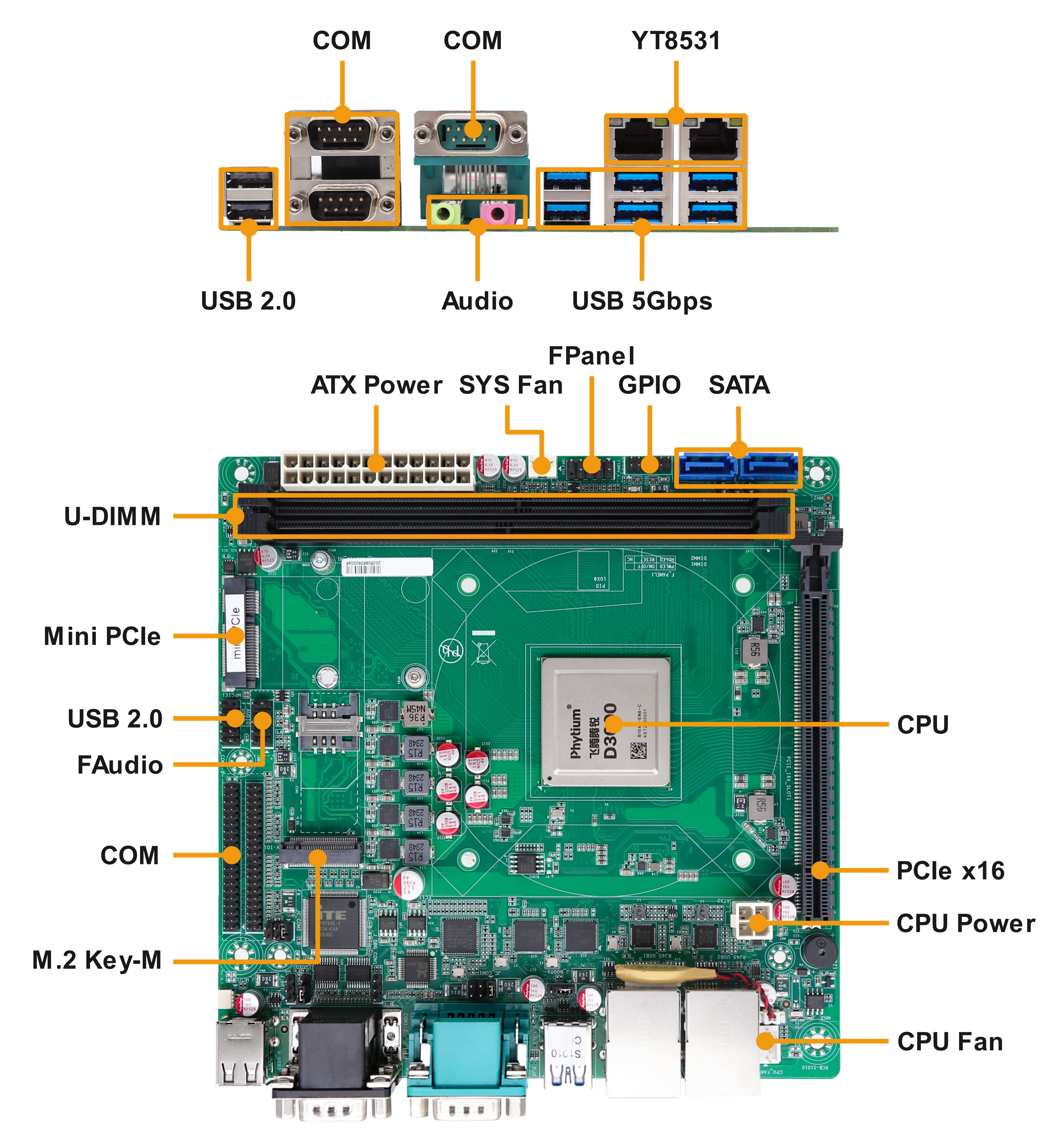 | Mini PCIe | 1 * Mini PCIe插槽(PCIe Gen 3 x1 + USB 2.0信号,附带1 * SIM卡插槽) | |